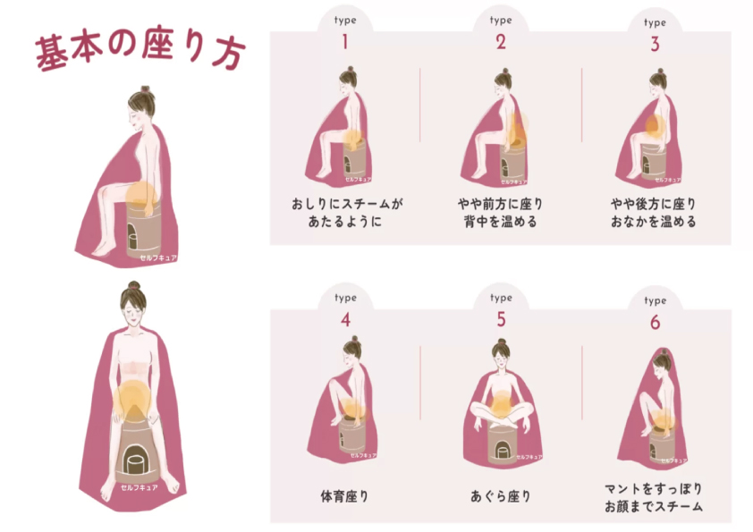 It is a Chinese therapy in which the steam from a decoction of mugwort is poured over and absorbed by the entire body, focusing on the lower body. It was developed by Yong Guifei in China 1,300 years ago, becasue she was often ill and suffered from menstrual pain and irregular periods, and it is said that she improved her health and beauty by using the Chinese herbs that are the basis of mugworth steaming to break down and expel toxins. And then it was introduced to Korea about 600 to 700 years ago, where it became popular as folk remedy. It is popular as a postpartum care.
